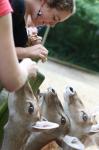 Het leek toen goed te gaan. Ze liep er weer op en maakte het zelf ook schoon en de zwelling nam af. Maar toen stopte ze met eten en drinken. En 2 nachten achter elkaar gaf ze over. Gisteren was Stef dan ook terug gegaan naar de da om te kijken wat dat kan zijn. Ze kreeg daar antibraakmiddel toegediend die de misselijkheid moest afnemen. Ze had geen koorts en haar poot zag er beter uit. We kregen Metacam mee, een pijnstiller omdat ze toch nog mank liep op haar poot. Ook een potje met een soort pate die lichtverteerbaar is voor als ze geen brokjes wou, dan zouden katten dit geweldig vinden. Een uur nadat ze bij de da was geweest zou ze brokken mogen hebben want dan werkte die prik. Maar die wou ze niet. Toen ik thuiskwam hadden we de pate geprobeerd, maar die wou ze ook niet. W moesten het dan aanmengen met water en dit in haar bek spuiten. Ik heb Senna nog nooit zo mak gezien! Ze liet alles toe en spartelde niet tegen. Ze spinde zelfs